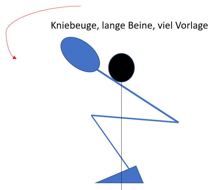 - Der Rückenwinkel ist stark vorn über gebeugt. Ein Rückenwinkel zum Boden von ca 45° entsteht.